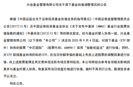 中国经济网络北京,最近9月8日新闻,Xingye Fund Management Co,Ltd发布了一份宣布对其资金表示赞赏的消息。该公告指出,在达成托管托管协议后,Xingye Fund Management Co,Ltd决定使用“ SMIC”股票“ SMIC”(股票代码:688981),由其基金(ETF除外)(除ETF除外)。同时,应根据上述股票的净共享值根据当天的净值部分来理解由LLINKETF基金持有的ETF目标。由于上述股票继续进行交易,其交易反映了市场上积极斗争的特征利用日价格上涨的资金继续赞赏,当时没有其他公告。